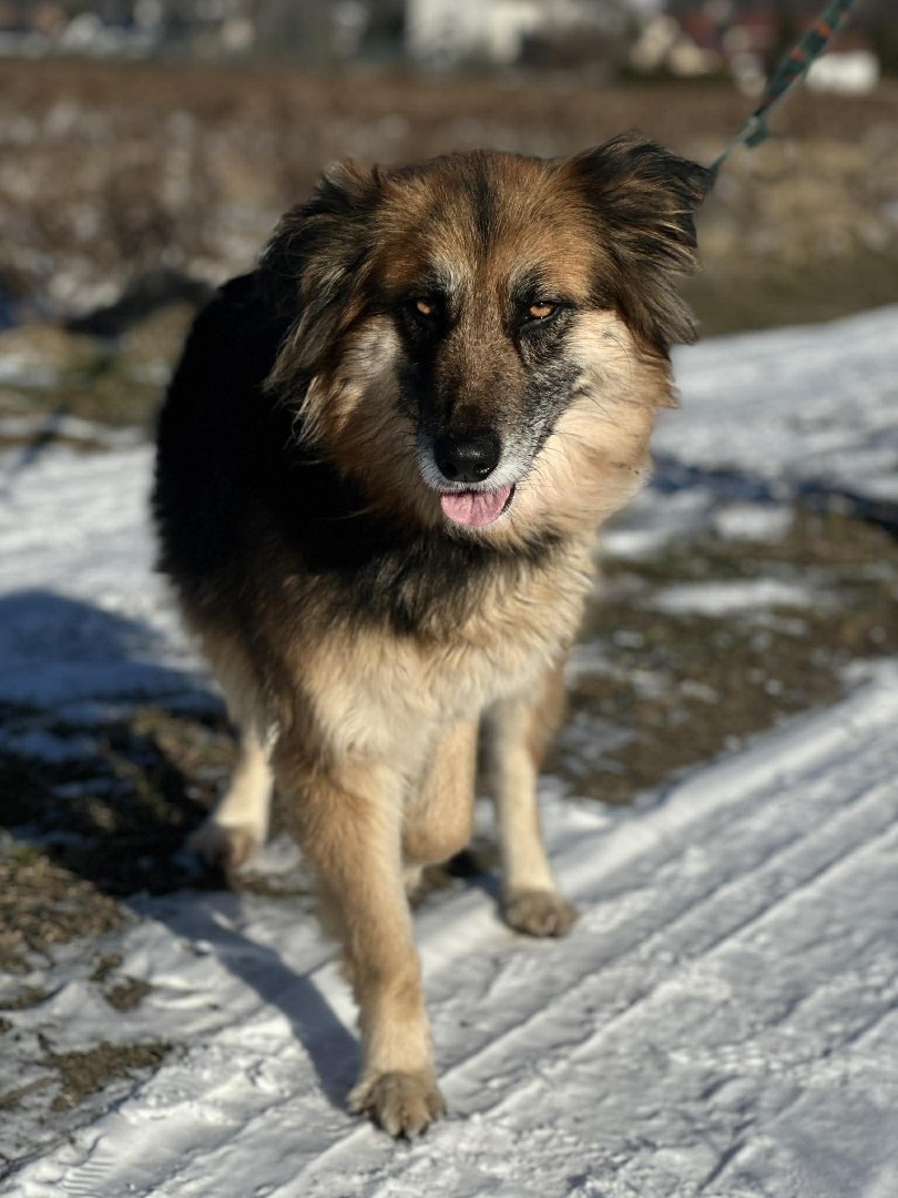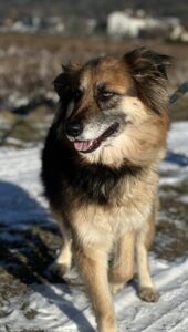 Wcześniejsze losy: Suczka trafiła pod naszą opiekę w wyniku interwencji. Zastaliśmy ją przypiętą linką do słupka przed drzwiami wejściowymi do domu. Wprawdzie linka spełniała wymogi minimalnej długości, ale zamiast obroży na szyi miała zimny łańcuch. Wokół panował ogromny bałagan – leżały potłuczone płytki, deski, szmaty i różne inne przedmioty, o które suczka mogła się na poranić. Wszędzie widoczne były odchody. Zamiast budy za schronienie miały służyć drzwi oparte o ścianę budynku. Nigdzie nie było widać misek z wodą i jedzeniem. Jak się dowiedzieliśmy, właściciel posesji zniknął ok. 4 tygodnie wcześniej. Nie dziwi fakt, że suczka była poważnie wychudzona i odwodniona. (Na posesji przebywała jeszcze jedna suczka, tyle że nie na uwięzi i biegając po wsi, była trochę dokarmiana, stąd była w lepszej kondycji. Ta psina także została przez nas zabrana.)